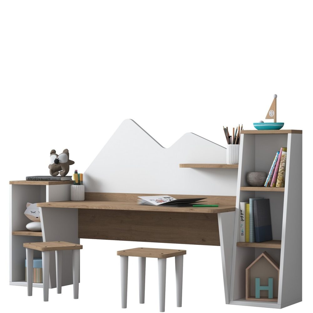 - Rafturi Spațioase: Biroul este dotat cu un raft mare și unul mic, oferind spațiu pentru cărți, rechizite sau jocuri, menținând ordinea în cameră.