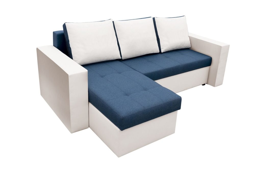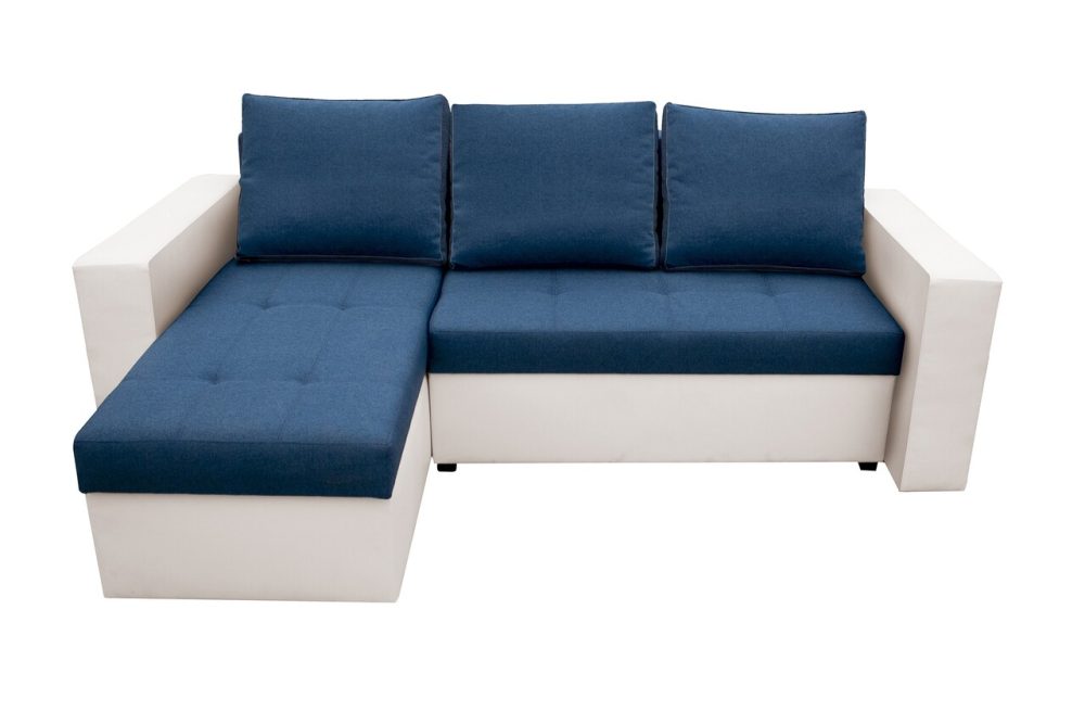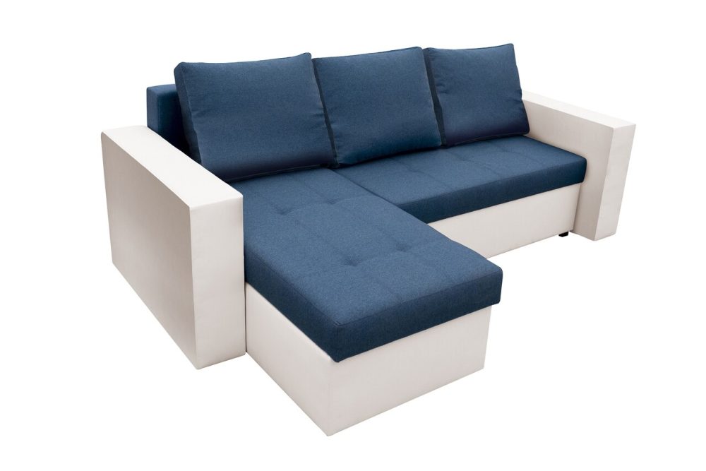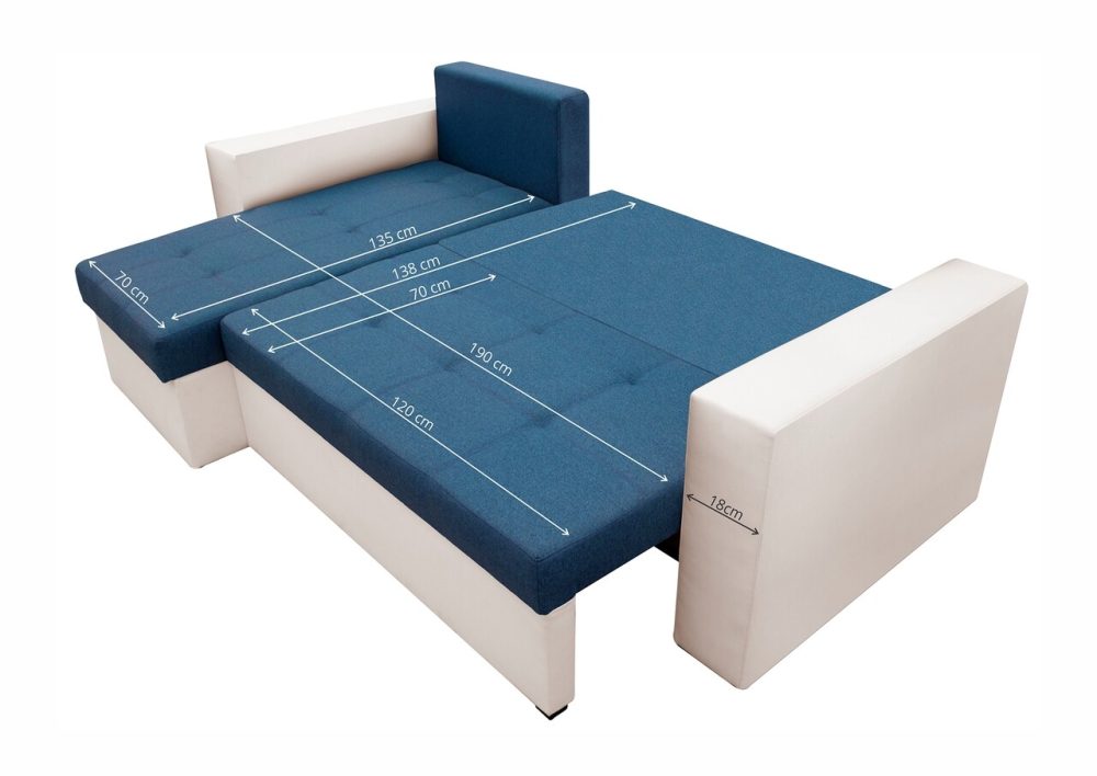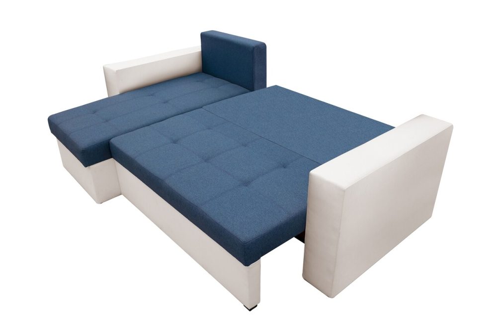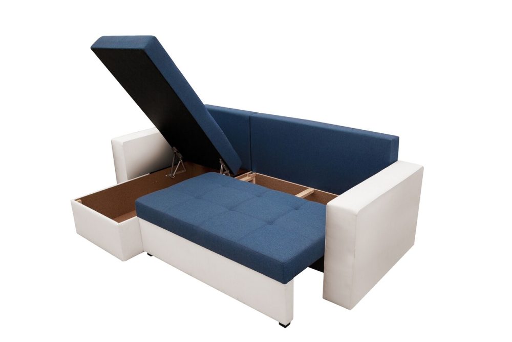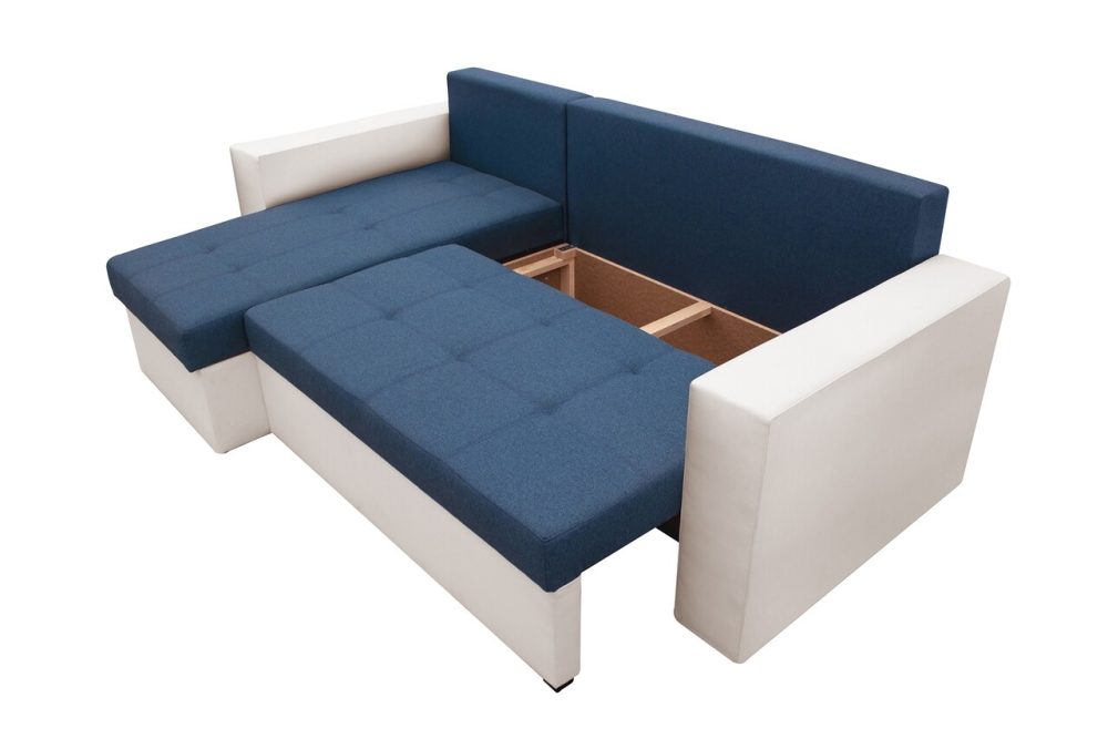 Coltar extensibil Toledo 226×145 cm alb/albastru petrol cu 2 lazi depozitare, reversibil, material textil si piele ecologica