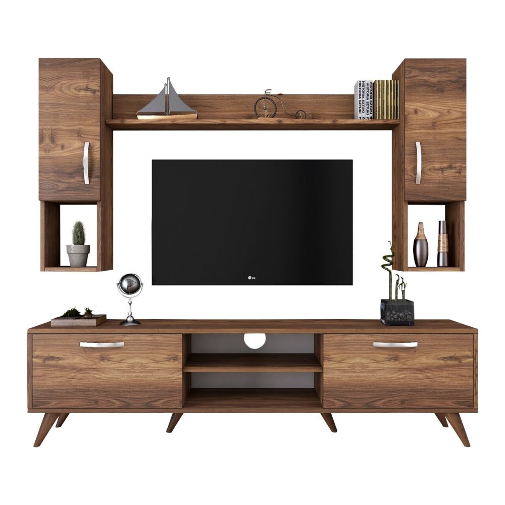 Comoda TV Wren cu raft de perete si 2 cabinete, 180 x 35 x 48.6 cm, walnut, asamblare necesara