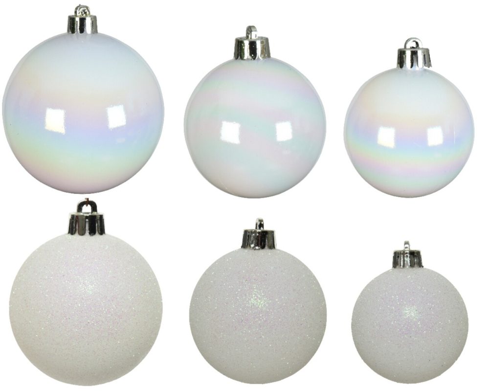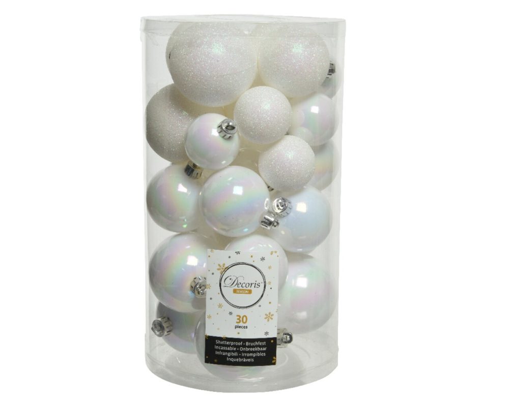 Cutie 30 globuri asortate Iris Mix decorativ plastic alb Ø4-6 cm