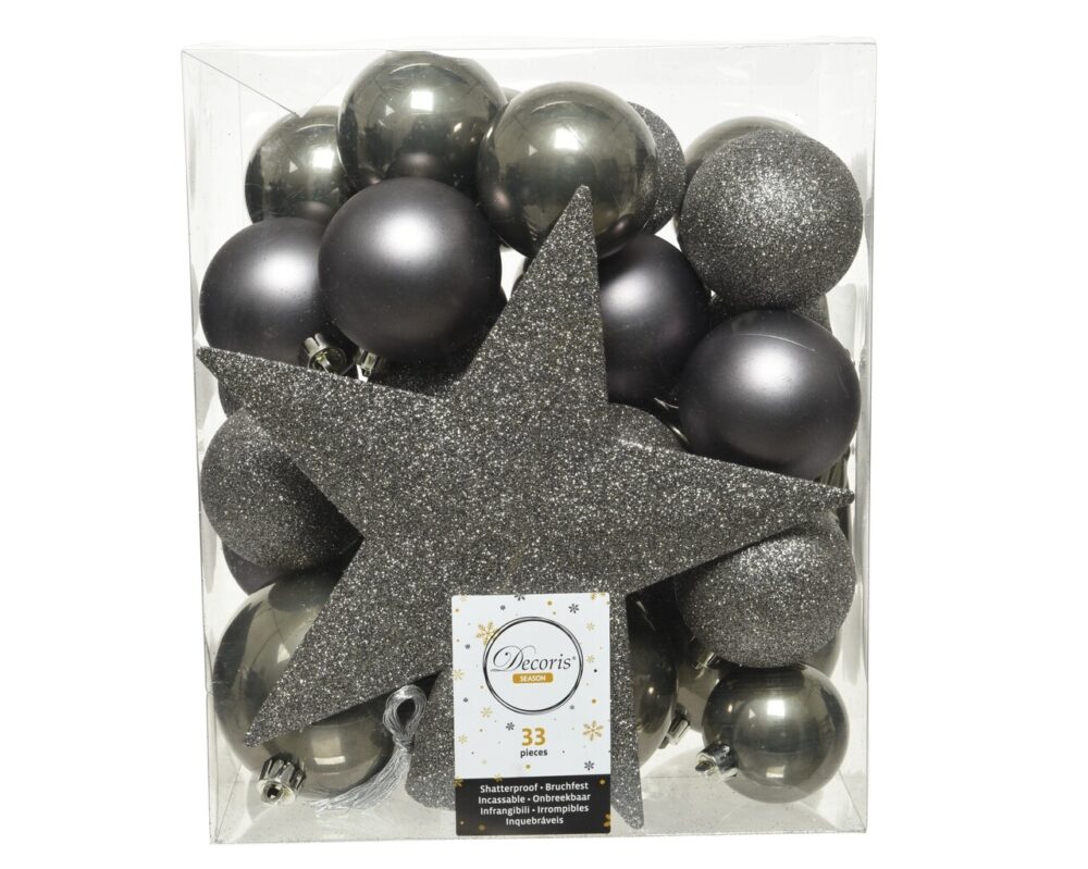 Cutie cu 33 globuri asortate și vârf de brad Star Silver – Decoris