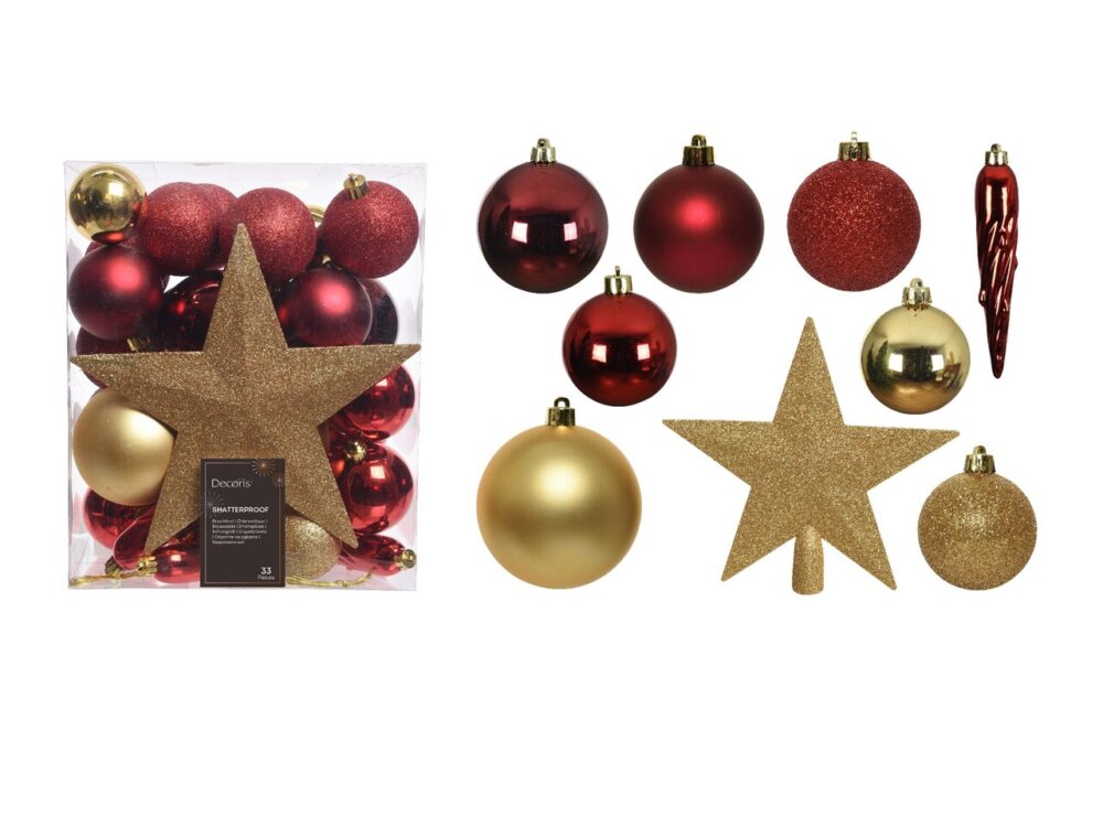 Cutie 33 globuri asortate si varf de brad Star, Decoris, plastic, rosu/auriu, globuri 80mm, 60mm, 50mm, decoratiuni Craciun