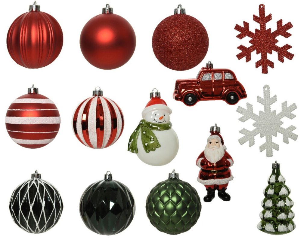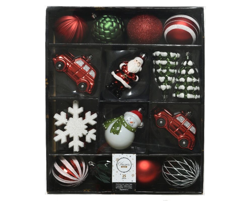 Cutie cu 25 globuri asortate din plastic rosu verde alb 8 cm omuleti masini brazi fulgi de zapada