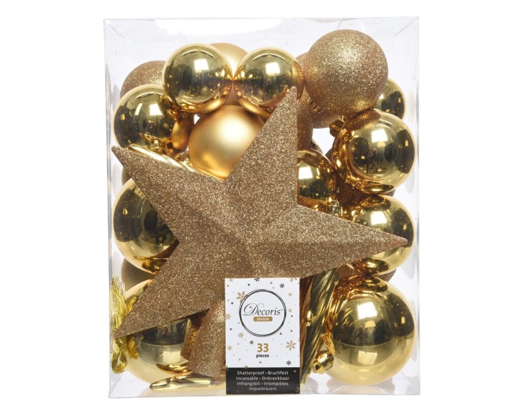 Cutie cu 33 Globuri Asortate și Vârf de Brad Star – Decoris