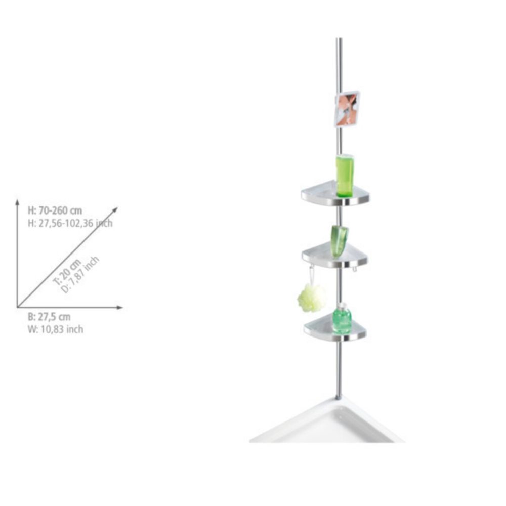 - Dimensiuni ajustabile: Cu o lungime de 27.5 cm și o înălțime care poate varia de la 70 cm până la 260 cm, această etajeră se potrivește perfect în colțul dorit al băii tale.
