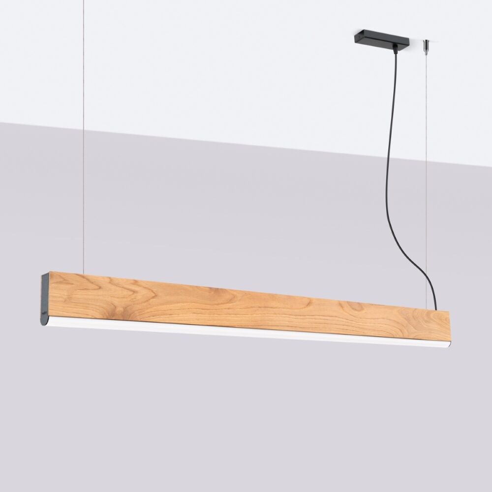 Lama suspendată LYKKE combină frumusețea naturală a lemnului cu tehnologia modernă de iluminat. Carcasa dreptunghiulară lungă este fabricată din lemn de stejar, ceea ce îi conferă un aspect cald, natural și se îmbină perfect cu interioarele de orice stil: rustic, clasic, scandinav sau modern sau chiar loft, rupându-i caracterul auster.