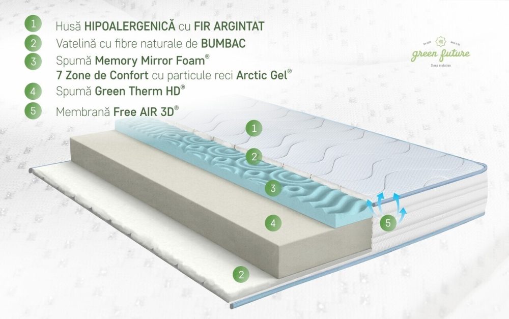- Strat de confort din Green Therm Memory cu particule Arctic Gel®: Reacționează la căldura corpului, eliminând punctele de presiune și asigurând o circulație a sângelui optimă.
