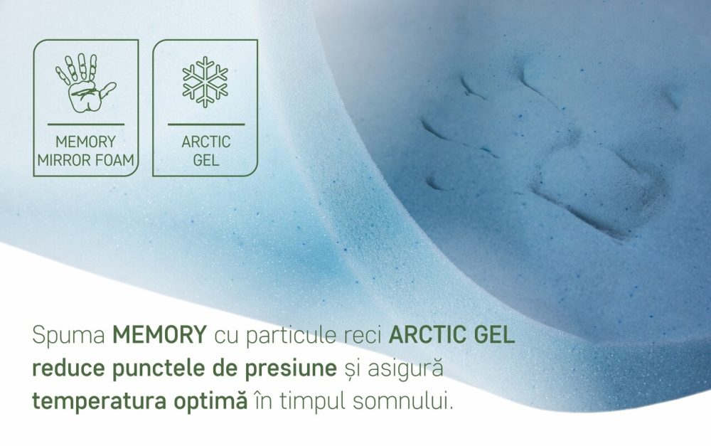 - Parte moale: Confortabilă și plăcută, cu un strat de 6 cm din spumă de memorie Arctic Gel®.