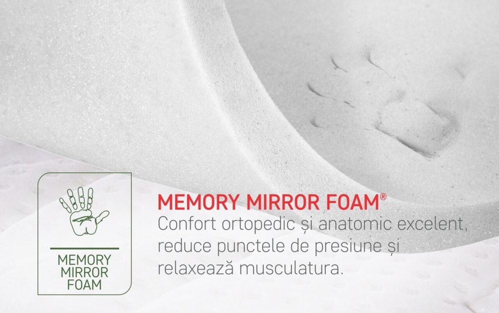 - Confort termic: Tehnologia spumei Memory Mirror Foam® reacționează la căldura corpului, eliminând punctele de presiune și relaxând mușchii.
