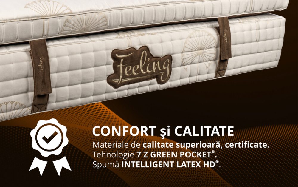 Oferind un echilibru intre tehnologie si confortul materialelor premium, baza saltelei Feeling Luxury este construită din micro-arcuri împachetate individual cu 7 Zone de Confort, acoperite de 2 straturi suport Green Form HD® care, impreuna cu Intelligent Latex HD® asigura un somn confortabil.