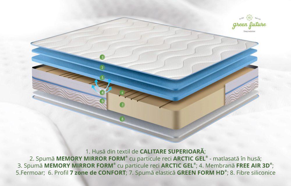 Saltea Green Future Arctic Gel Memory 160×190 cm 7 zone de confort ortopedică cu spumă elastica Green Form HD și gel rece