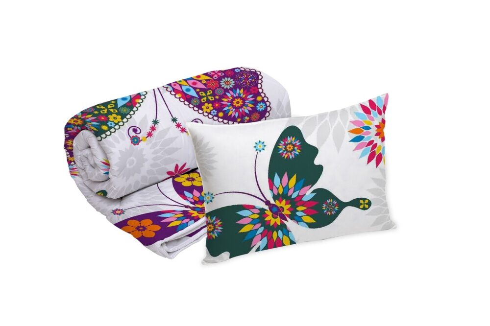 Set Alcam Papillons perna microfibra 50×70 cm si pilota matlasata 140×200 cm, design colorat, umplutura puf siliconic, confort optim pentru orice anotimp