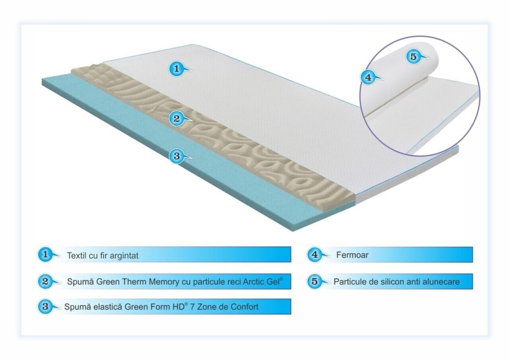 Topper Green Future Argentum Therapy Memory Arctic Gel 90×200 cm 7 zone de confort spuma elastica antistatica pentru somn sanatos